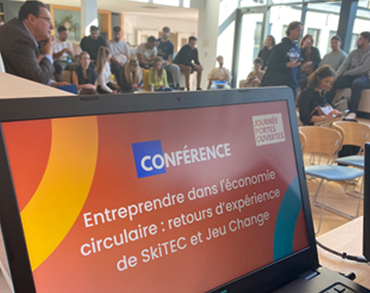 Jeudi 22 Septembre, nous avons animé, dans le cadre de la journée porte ouverte du Pôle Entrepreneurial, une conférence sur la thématique « Entreprendre dans l’économie circulaire » avec Emilie Vuillequez de SkiTEC et Juliette Maquaire de Jeu Change...