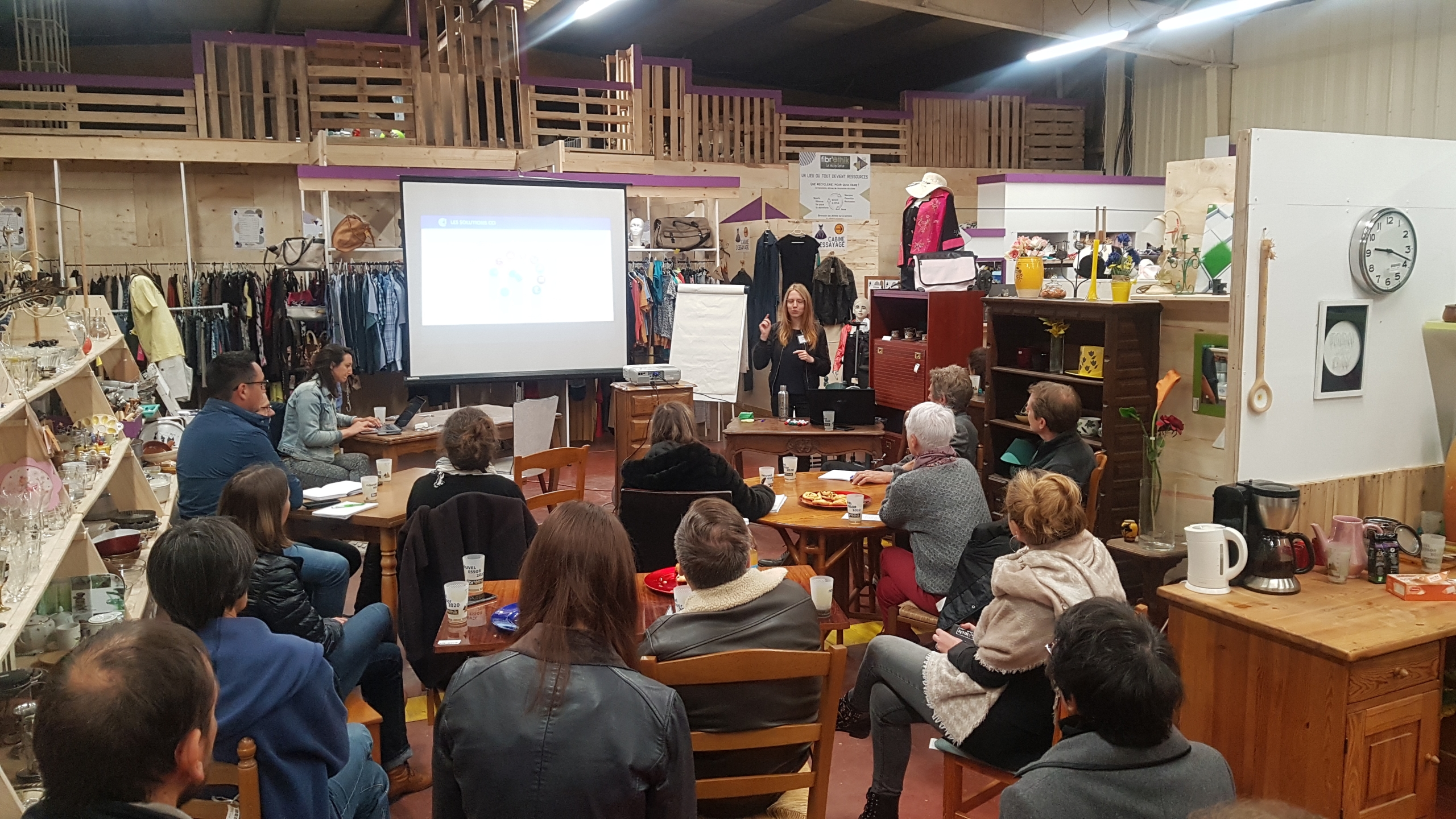 Une vingtaine de participants se sont réunis dans la Recyclerie de Fibr’Ethik, composés d’adhérents et quelques membres du CA de SoluCir, mais aussi d’acteurs du territoire Cœur de Savoie qui venaient découvrir ce que c’est l’économie circulaire.